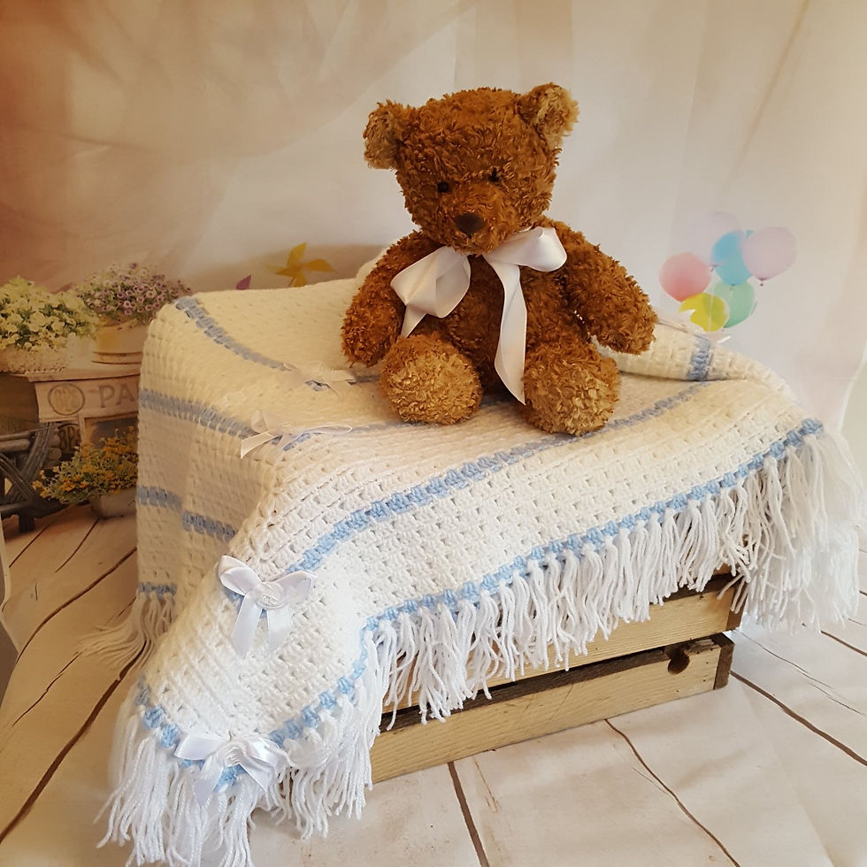 ![]() 20170612_145537Pink blanket with white ribbon & bows 30"x 20" | ![]() 20170612_144605White shawl with blue pattern and trim with lace bow and frill 50"x 50" | ![]() 20170612_140148Blue blanket with white ribbon trim & corner flower 34" x 34" |