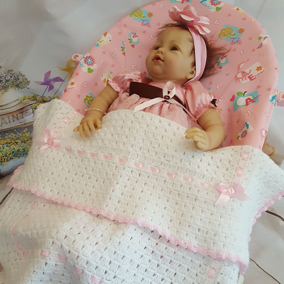 ![]() 20170612_150434Pink shawl with white pattern and pink ribbon bows 45"x 45" | ![]() 20170612_150247White shawl with pink pattern and white frill 45"x 45" | ![]() 20170612_145650White blanket with pink trim, ribbon & bows 27"x 24" |